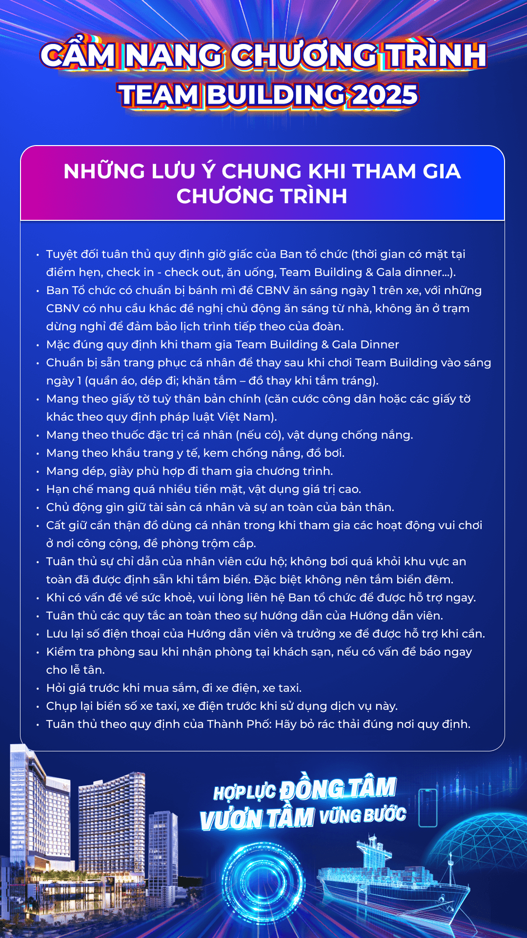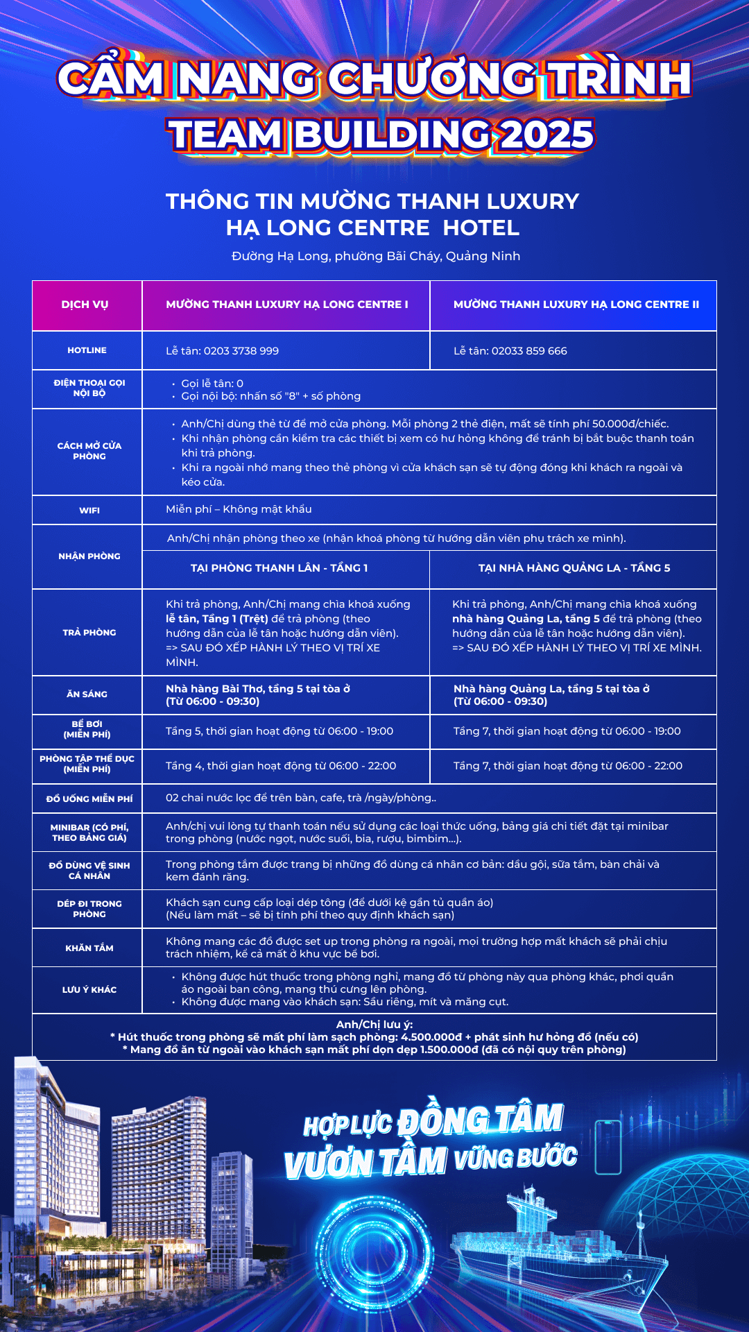 Cẩm nang này là tài liệu không thể thiếu dành cho Quý Anh/Chị trước và trong suốt hành trình Teambuilding tại Hạ Long. Nội dung bao gồm những lưu ý quan trọng từ Ban Tổ Chức, thông tin chi tiết về khách sạn lưu trú, hướng dẫn sử dụng dịch vụ, các phương tiện di chuyển địa phương, và gợi ý điểm vui chơi – giải trí tại địa phương. Mọi thông tin đều được tổng hợp nhằm hỗ trợ Quý Anh/Chị chuẩn bị kỹ lưỡng, đảm bảo trải nghiệm chuyến đi an toàn, trọn vẹn và đáng nhớ.